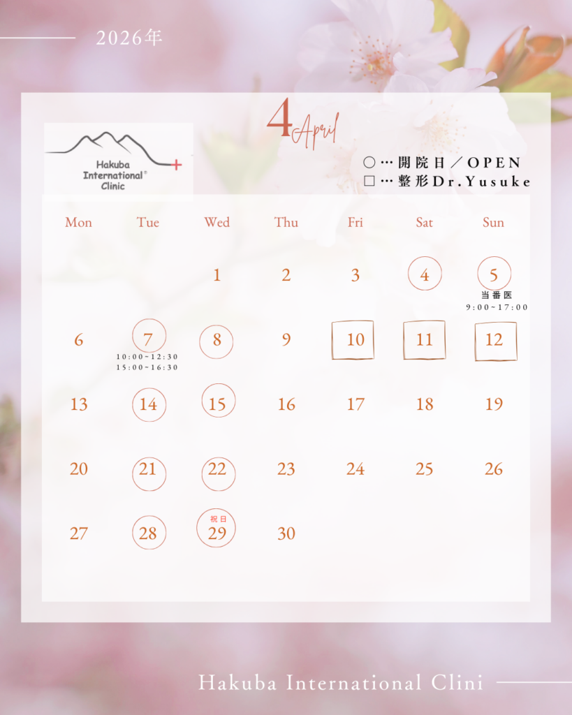 3月休診のお知らせ、4月の診察予定表3月21日まで、毎日診療中です!4月は、4日(土)より診療再開いたします!院長の、のぞみDrが育休から復帰予定です!火曜日、水曜日はのぞみ院長の診察予定となっております!